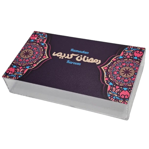 Rectangular clear acrylic box with a purple ornamented box with Ramadan Kareem printed in Arabic and English. Dimensions:10" X 6" X 2" (26.5 X 15 X...