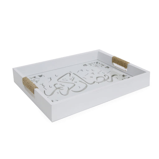 Wooden tray with a beautiful carved base. Ornaments and "Ramadan Kareem" carved on its base. Jute ribbon wrapped around its handles. Beautiful piec...