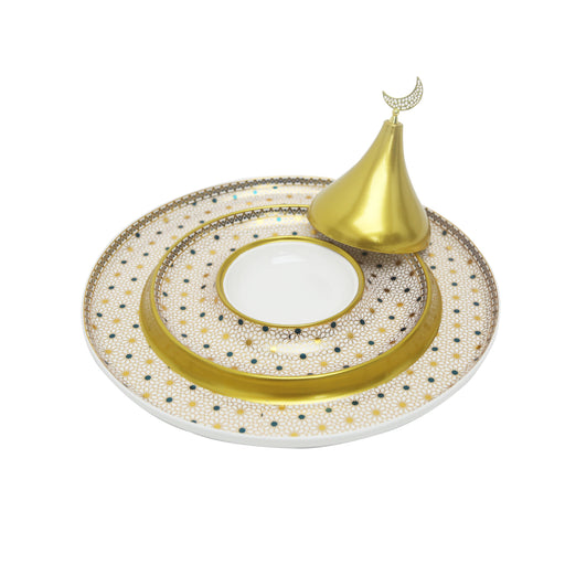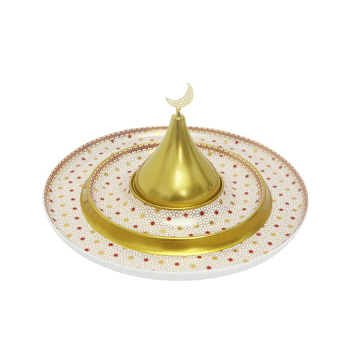 Ceramic Serve Dome comes in two pieces. A plate and a cone shaped cover with a moon motif on top of the dome. "Ramadan Kareem" is hand painted in g...