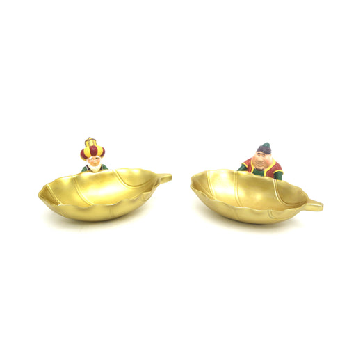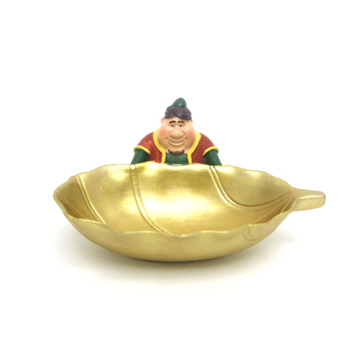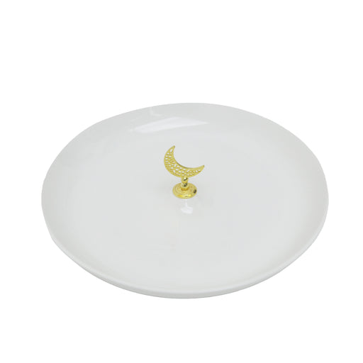 White ceramic plate with a golden carved moon shaped handle in the center. This plate can be used to serve dessert and other treats. Place rosaries...