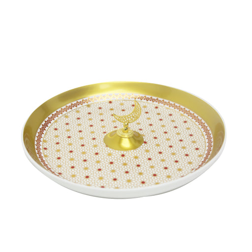 Patterned ceramic plate with a golden carved moon shaped handle in the center. This plate can be used to serve dessert and other treats. Place ro...
