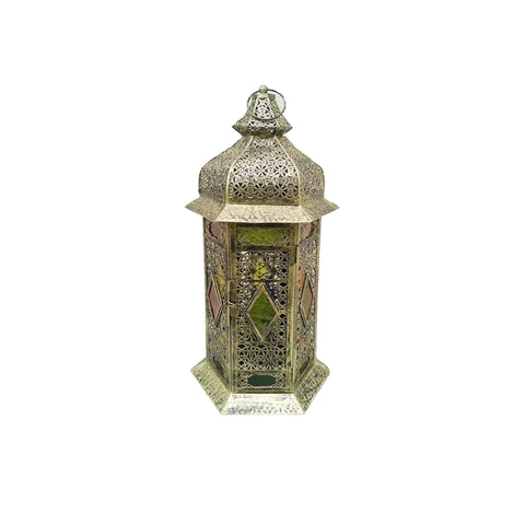 Colored glass antique gold metal lantern. A top knob available for hanging if desired.